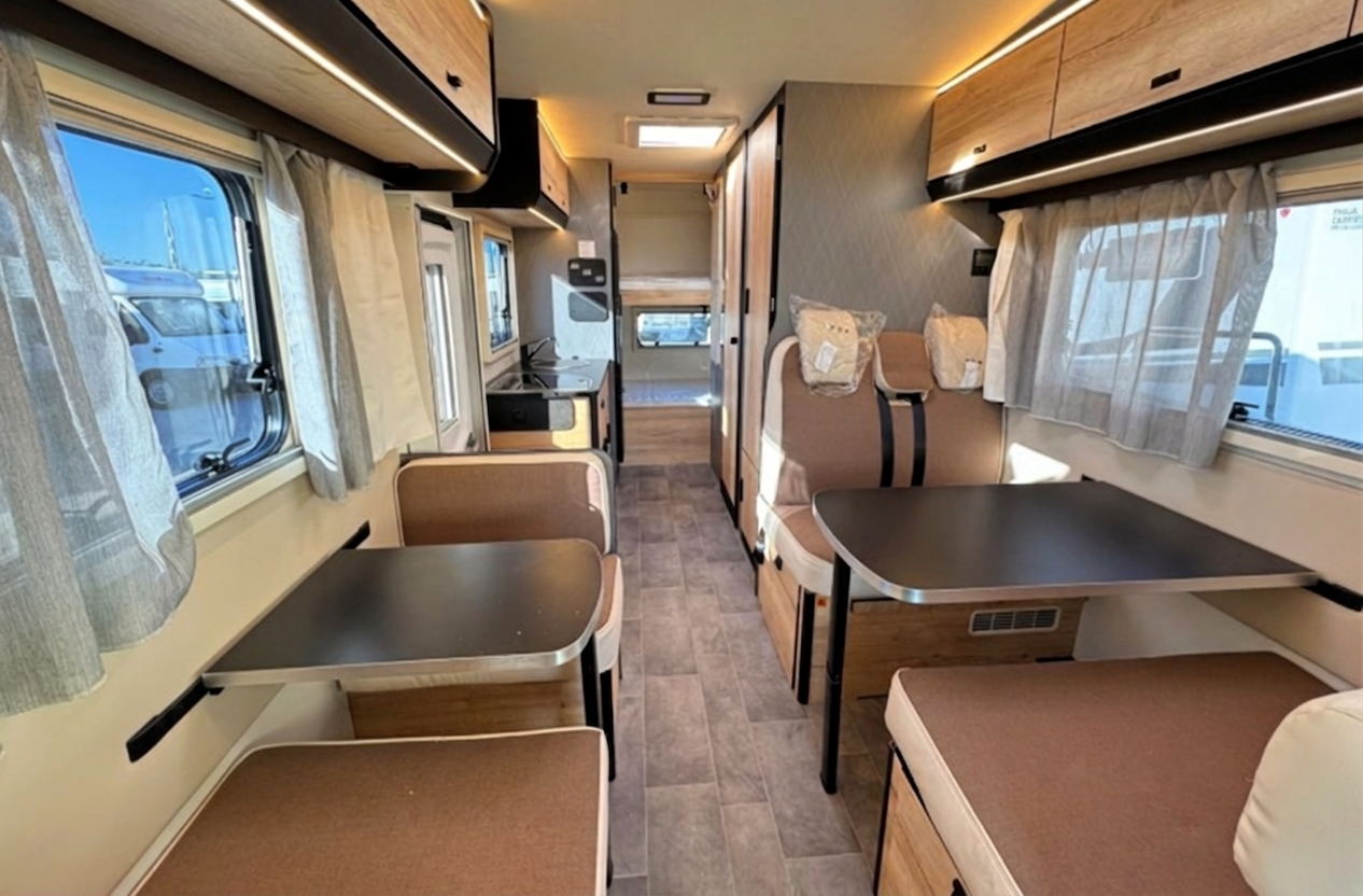 Camper mansardato con 7 posti letto e una disposizione interna molto versatile. Dispone di una doppia dinette: una grande con sedute contrapposte e una più piccola laterale, entrambe trasformabili in comodi letti.
