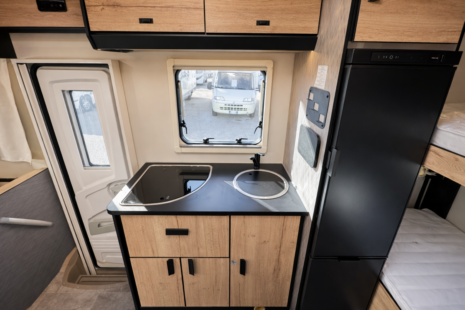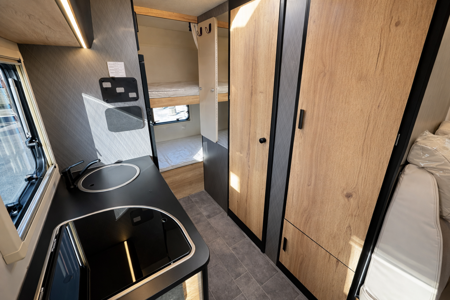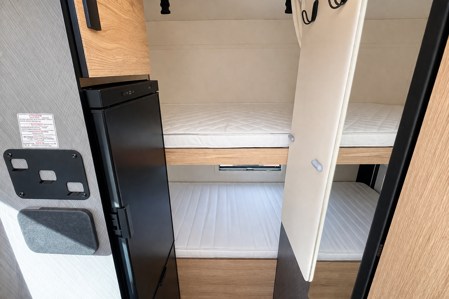 Nella parte anteriore è presente un ampio letto matrimoniale in mansarda, mentre nella zona posteriore si trovano letti a castello trasversali sopra un garage con volume variabile, ideale per il trasporto di bagagli, biciclette o attrezzature.