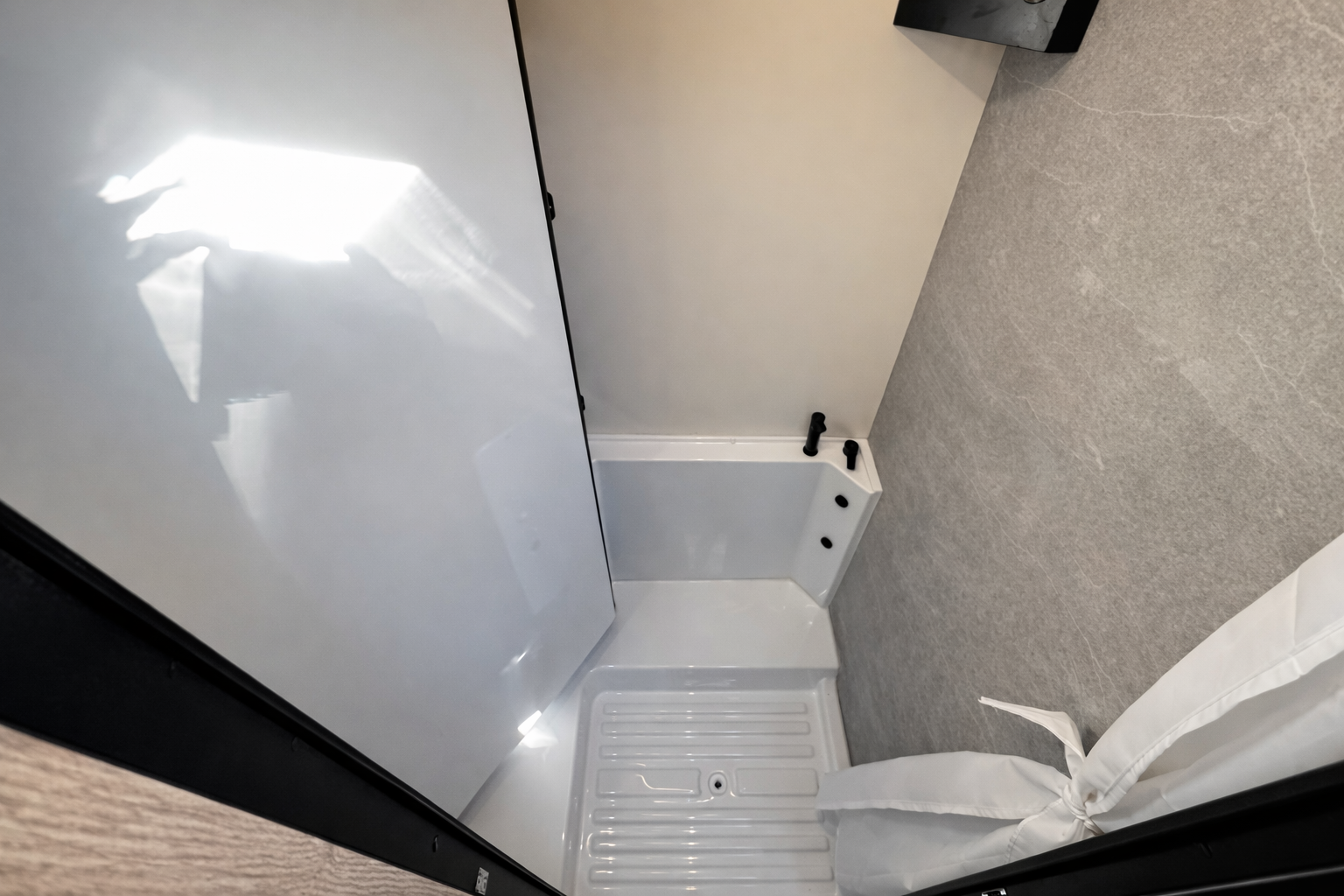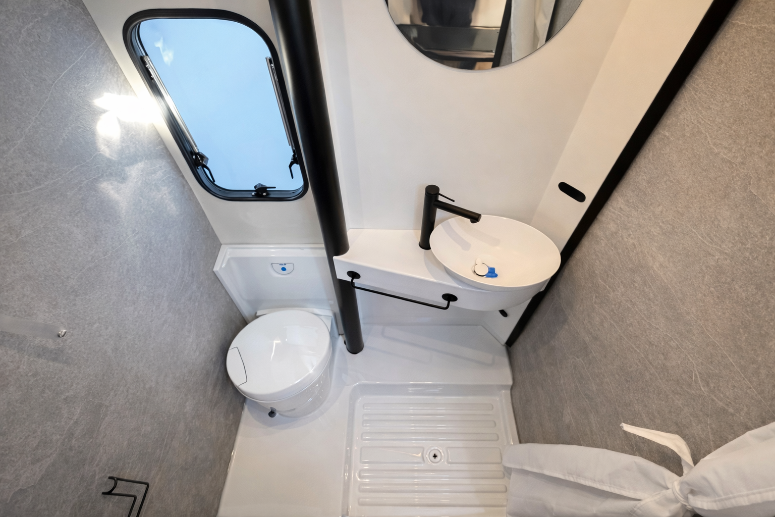 La cucina è completamente attrezzata per la preparazione dei pasti durante il viaggio, mentre in coda si trova un bagno spazioso con doccia separata.